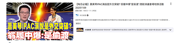 2025年11月9日此人露餡了,程度之差,不令人意外。 翁履中在《中間觀點 - 翁P聊時事》節目中坦言,外交人員「要鋪陳這些事情」確實很辛苦,但平心而論,蕭美琴這次進入歐洲議會根本不是外交突破,頂多可以說是偷渡;翁履中舉例,這就像一個老師以「模擬聯合國」的名義借用私人小房間、邀請中華民國外交官,並對外聲稱首次進入聯合國演說。