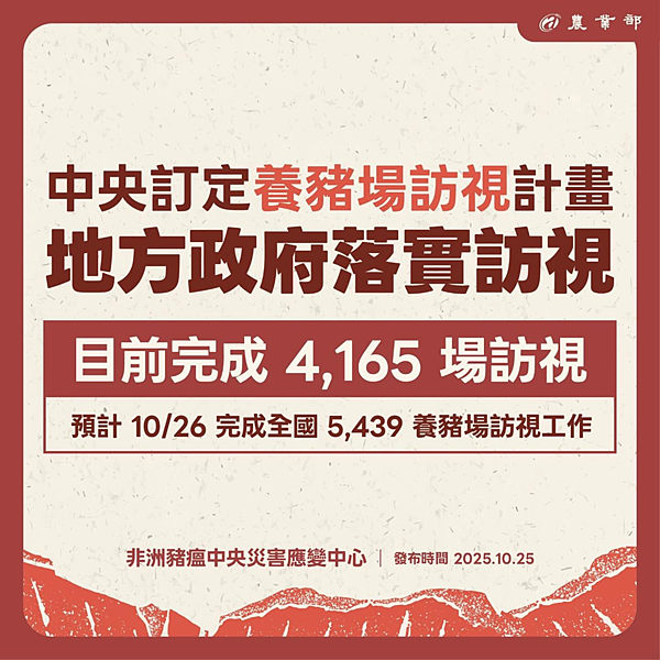 台中市梧棲地區養豬場10/22爆發非洲豬瘟,相對於其他農牧大縣,台中市並非養豬大縣,經過多日追查,台中市共有168場養豬場,其中16場為停養狀態,共有152場包括40個關聯場,檢測都是呈陰性,行政院長卓榮泰2025/10/26主持防疫會議,宣布全國豬隻禁運禁宰再延長10日。
